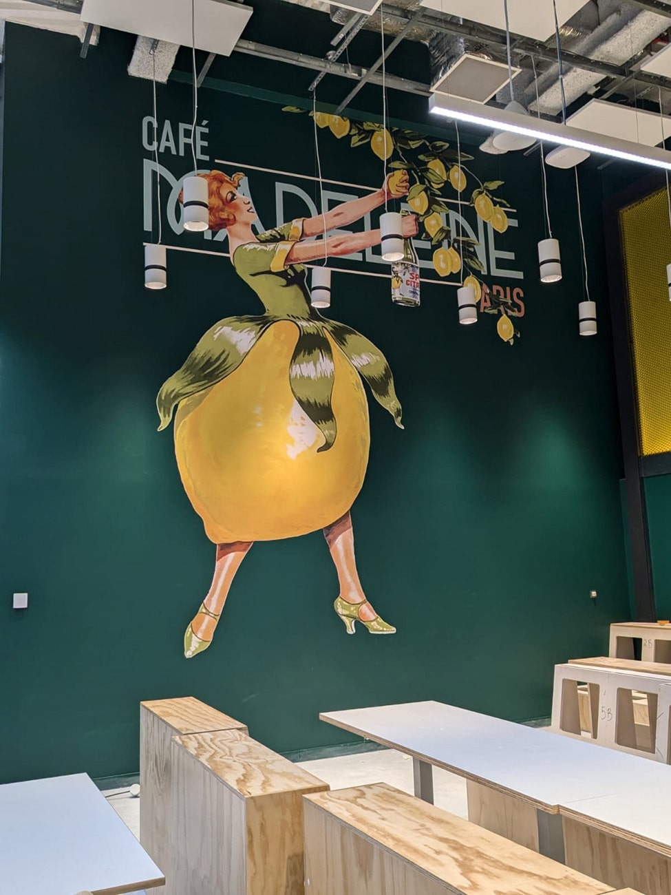 • Une impression sur adhésif très grand format de 6 mètres de haut de la « Dame Citron », qui incarne le Café Madelaine