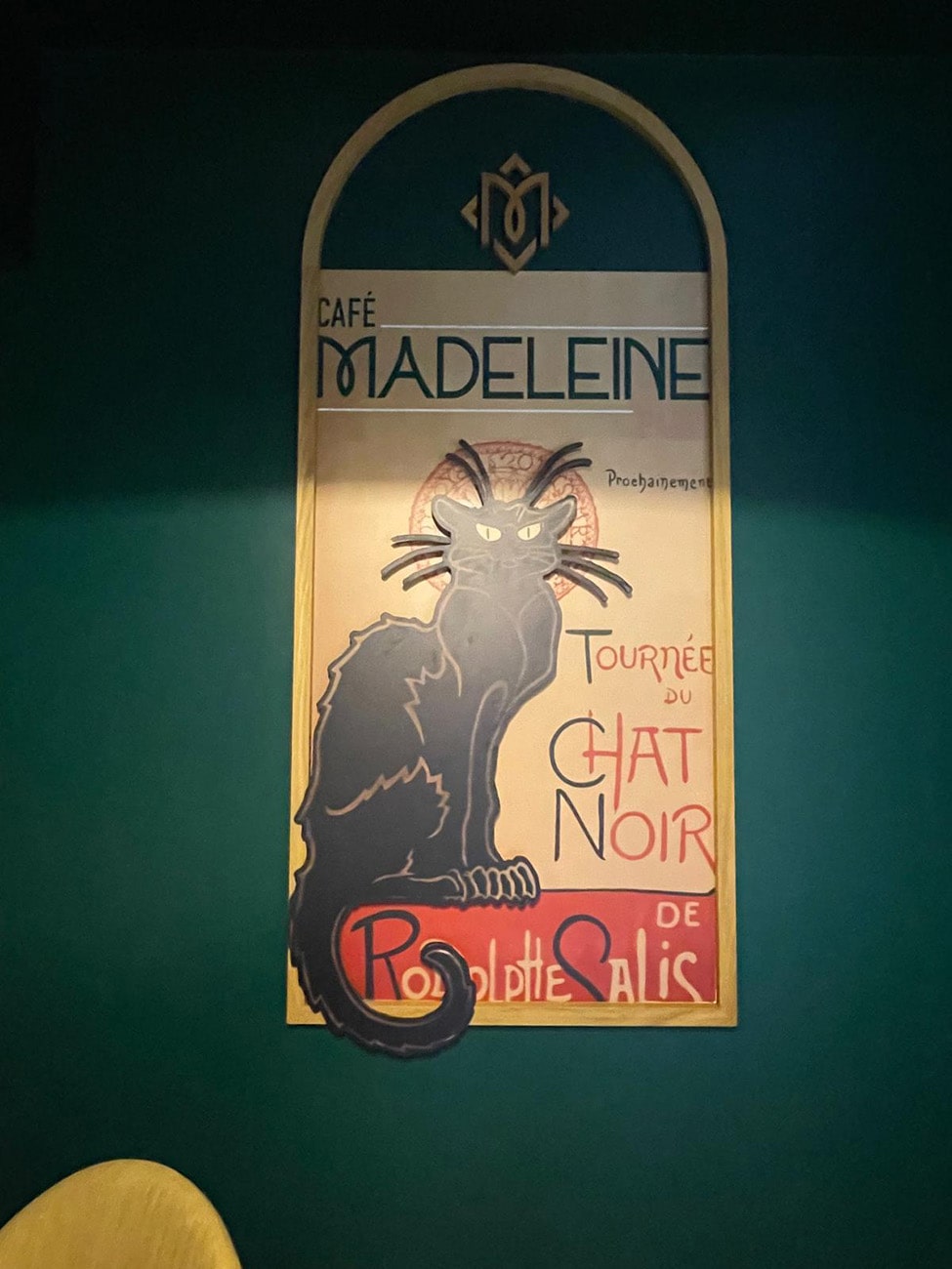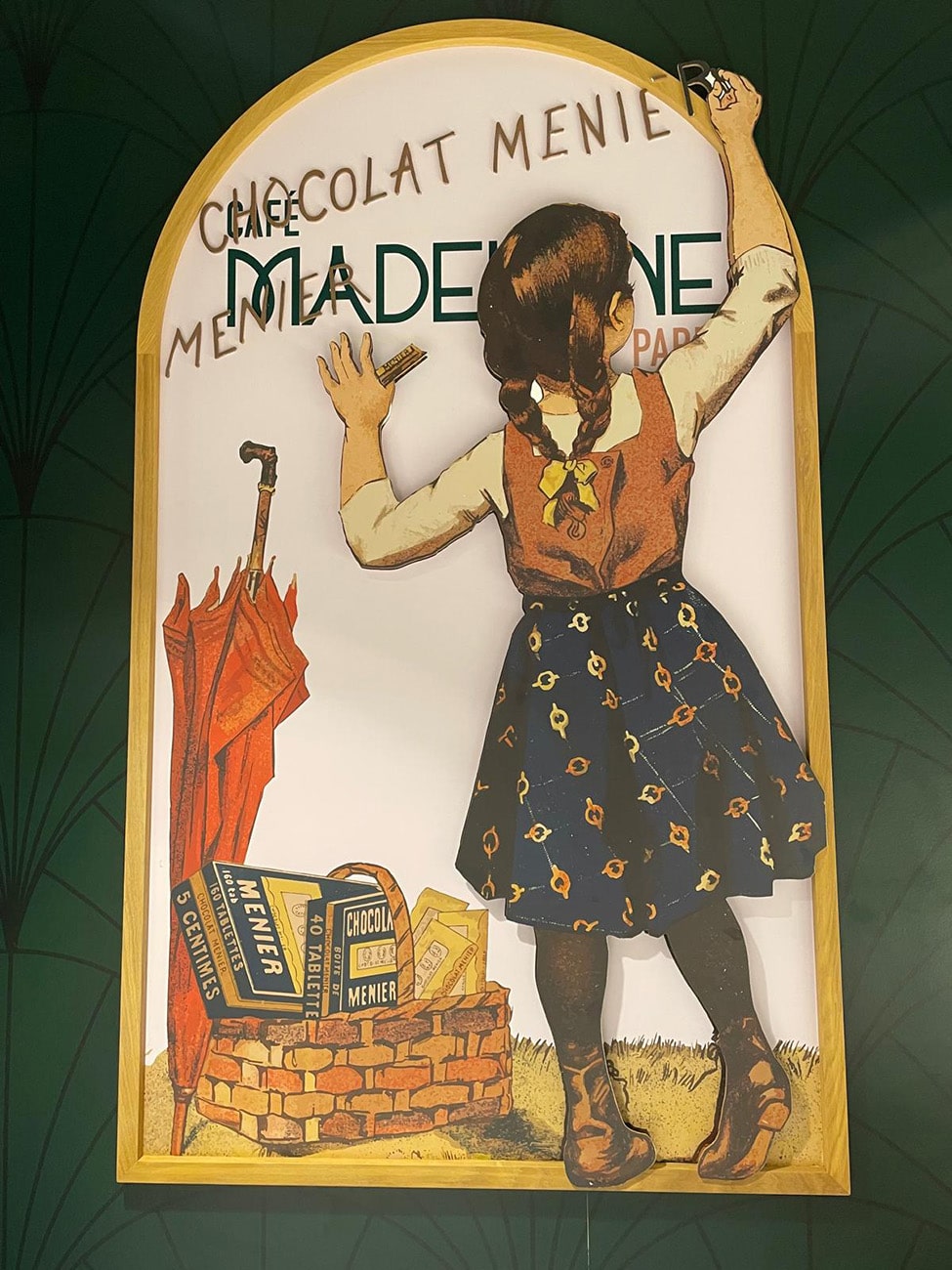 • Le célèbre chat noir, la petite fille Chocolat Meunier, des parapluies, ou encore des chapeaux découpés qui sortent de leur cadre, posés sur entretoises pour donner du relief