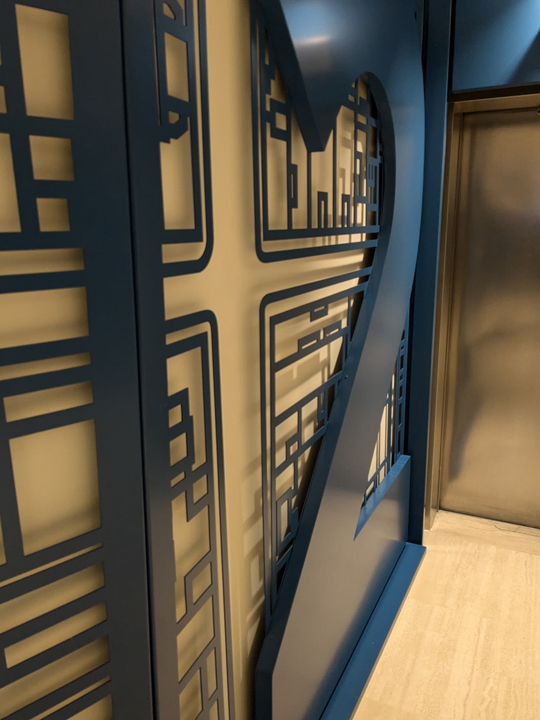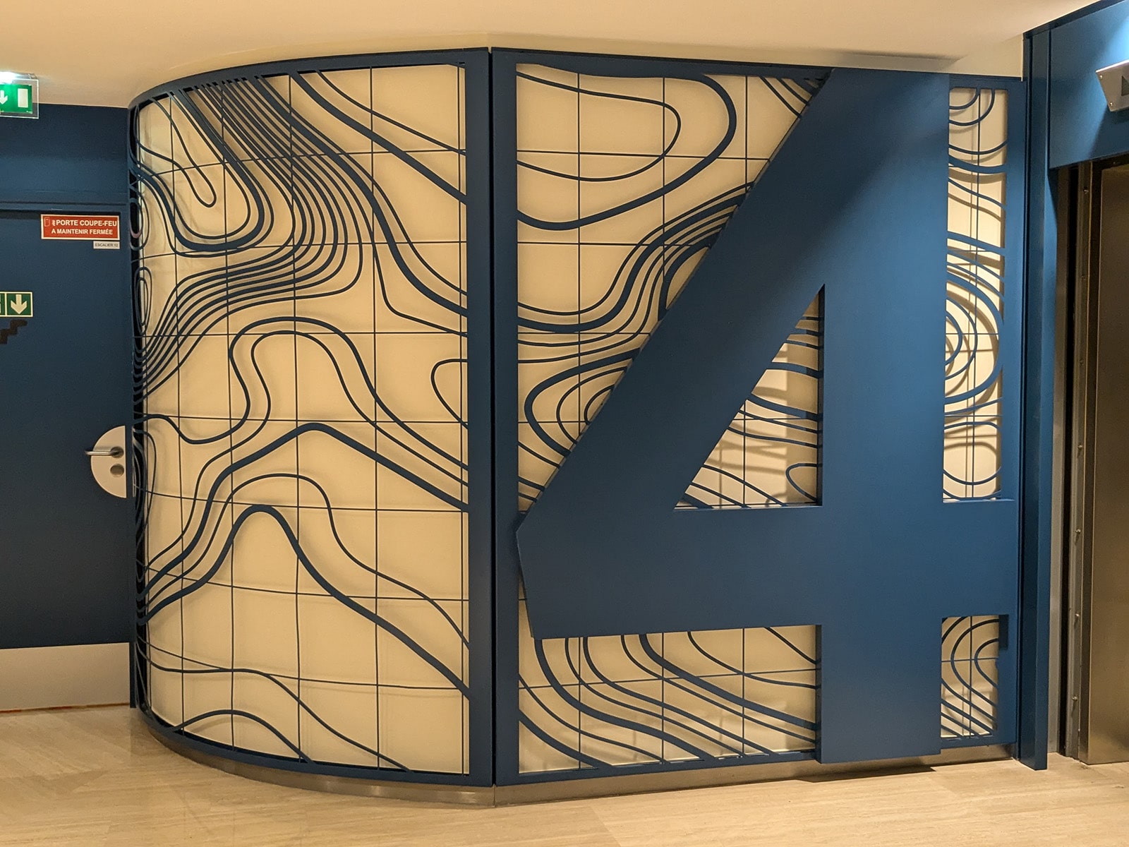 • La conception et l’installation de fresques en tôle acier découpée, laquée et cintrés aux arrondis des paliers de la tour